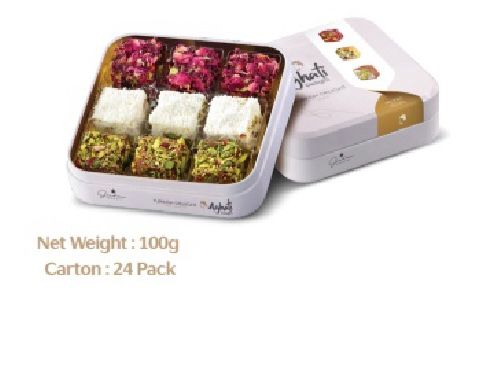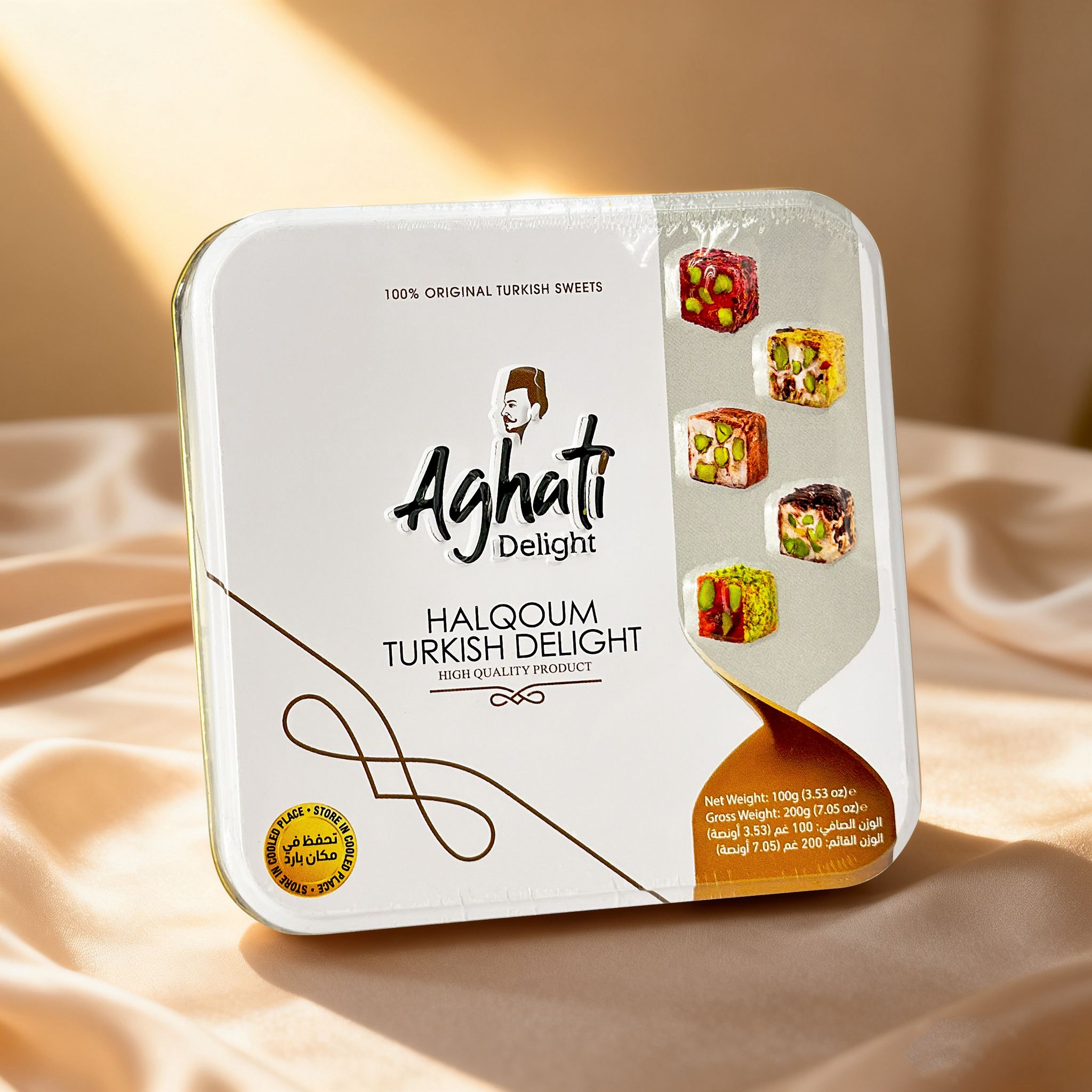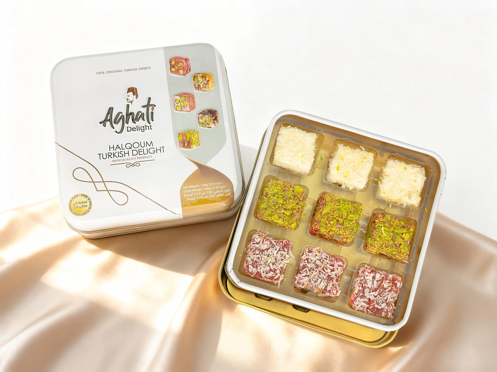 A box of Aghati Halqoum Turkish Delight Assorted Delights, 100g – imported from Jordan, showing colorful pieces with pistachio, coconut, and fruit flavors. Aghati Sweets – Assorted...